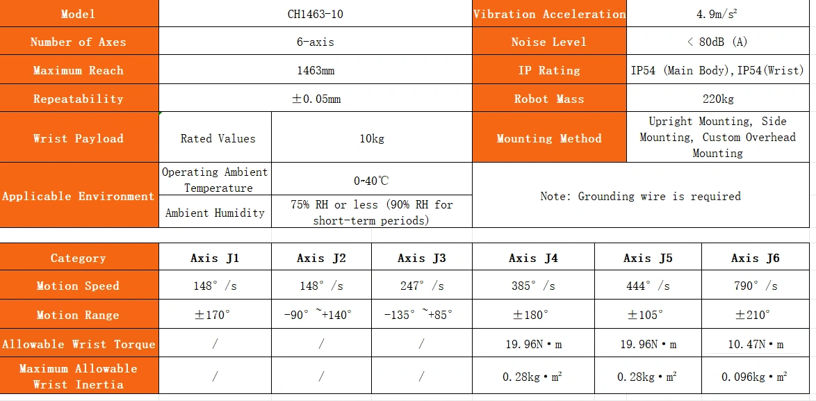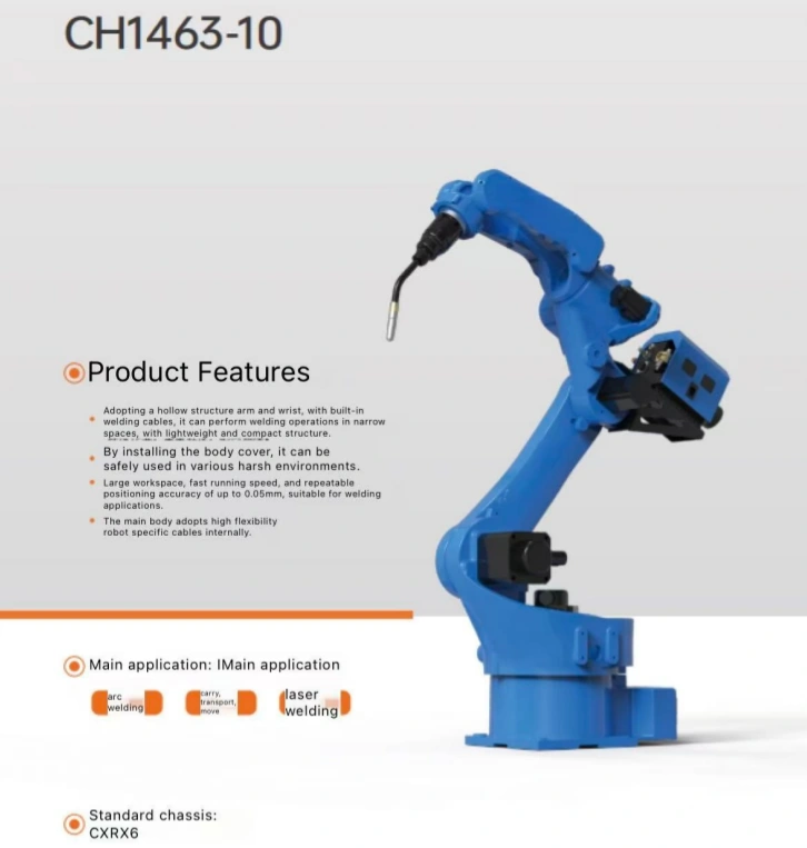 This is the **CH1463-10 arc welding-specific 6-axis industrial robot**, optimized and designed for welding applications. It features hollow-structured arms and wrists with built-in welding cables, enabling operation in narrow spaces with a compact and lightweight design. With a 10kg payload, 1463mm reach, and ±0.05mm repeat positioning accuracy, it delivers fast operating speeds and is suitable for processes such as arc welding, laser welding, and material handling. It effectively improves welding quality and efficiency, reduces labor costs, and helps factories achieve automated welding upgrades.