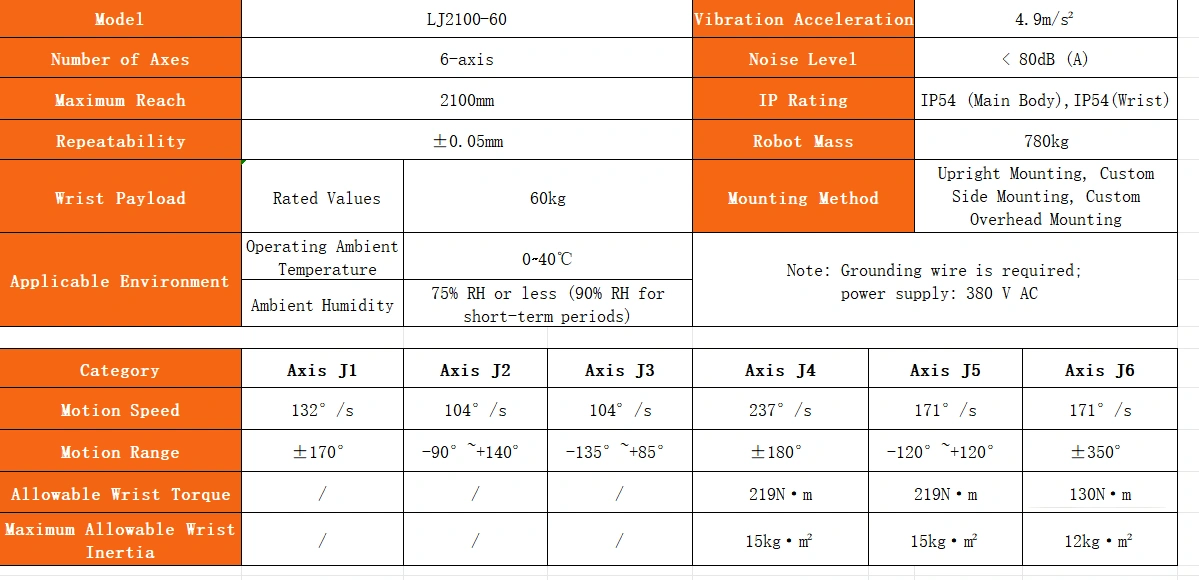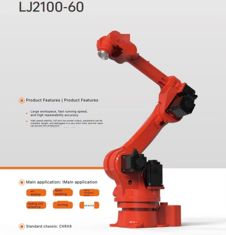 This is the LJ2100-60 high-performance 6-axis industrial robot, designed for multi-functional operations. With a 60kg payload, 2100mm reach, and ±0.05mm repeat positioning accuracy, it features a large workspace, fast speed, and high stability. It supports quick installation and deployment, excelling in welding, handling, sorting, and spraying tasks to boost production efficiency and reduce labor costs.